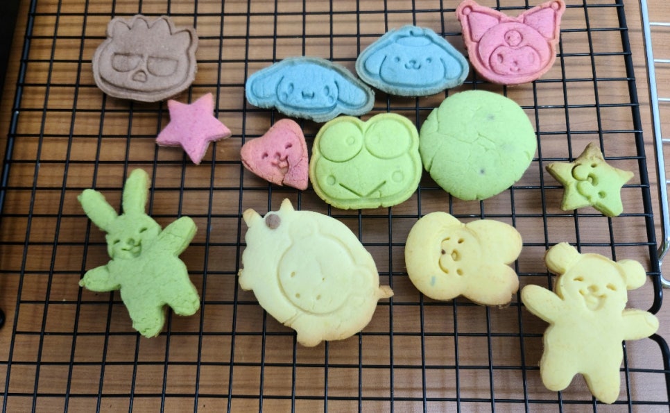밀대로 반죽을 민 후 원하는 쿠키틀로 찍어 초코펜등으로 꾸민 뒤 오븐에서 20여분 구우면 끝!!!!